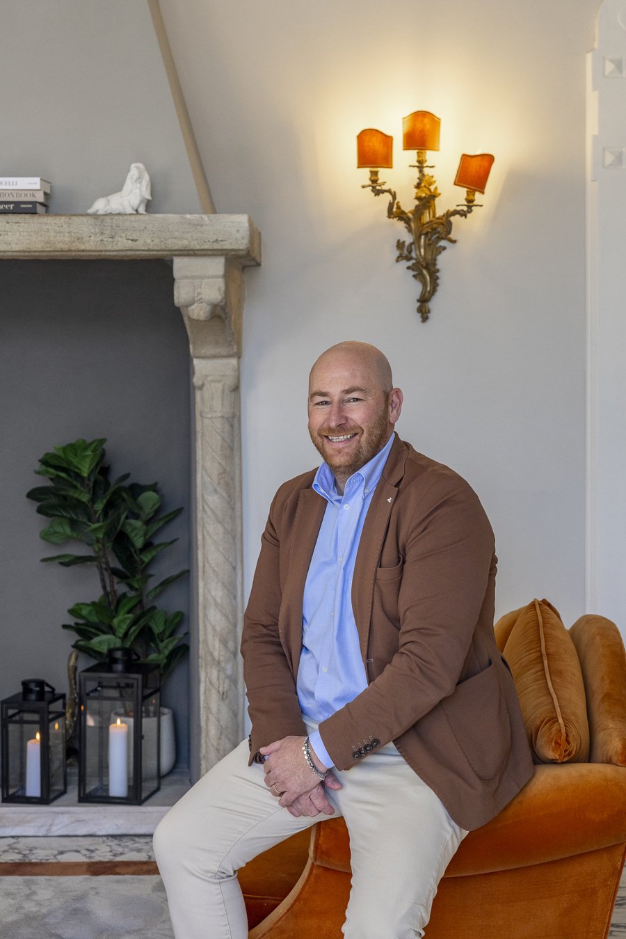 • Una donna sorridente con capelli neri, vestita in abbigliamento nero, indossa orecchini dorati e un orologio, si trova accanto a un camino a parete di mattoni rossi.