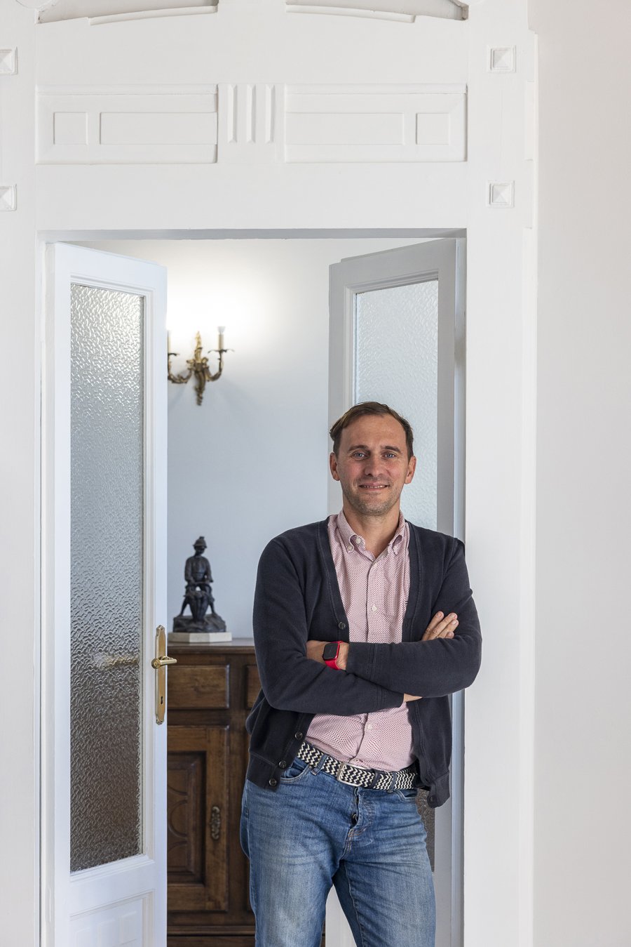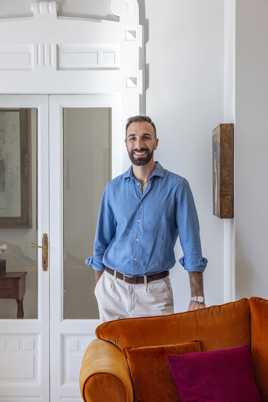• Una donna seduta su una poltrona rosa con motivo a pois, che sorride. Dietro di lei un dipinto di uno stile astratto con figure umane nude.